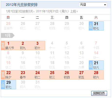 2012元旦的假期安排已經(jīng)確定了,具體的安排時間如下: